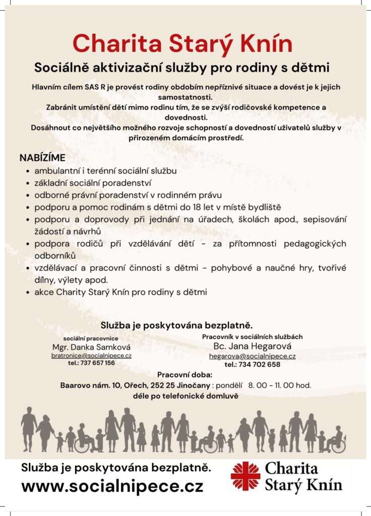 Farnost Ořech ve spolupráci s Charita Starý Knín nabízí rodinám s dětmi sociální podporu prostřednictvím Sociálně aktivizačních služeb pro rodiny s dětmi. Tato služba je určena rodinám, které se nacházejí v obtížné životní situaci a potřebují odbornou pomoc při zvládání běžných výzev spojených s péčí o děti a rodinným fungováním.
